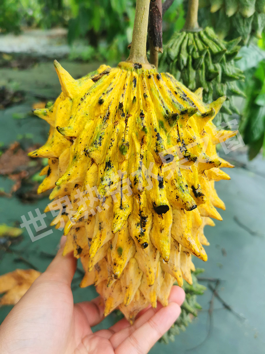 在海南琼海世界热带水果之窗一颗颗金灿灿的“巨无霸”正悬挂枝头 ——霹雳黄龙释迦,这个单果可达10斤重,吃起来的感觉就像果冻一样,软嫩香滑,超级惊喜!