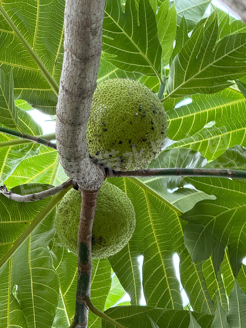 无籽面包果,一种既可作为水果、又能充当主食的热带作物,属于桑科波罗蜜属,和波罗蜜是亲兄弟,原产于太平洋群岛及印度尼西亚、马来西亚等地,海南盛大现代农业开发有限公司成功引种并于2022年在海南实现挂果。