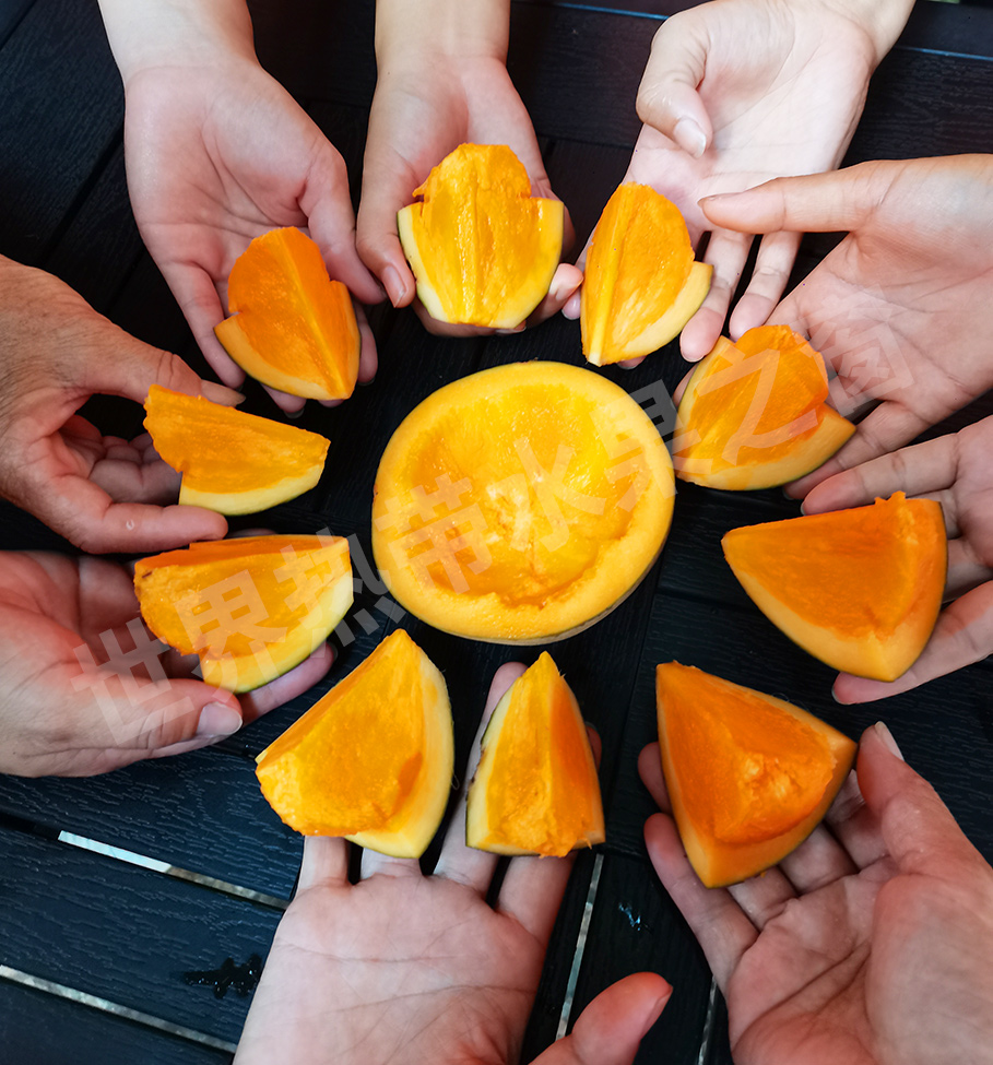 在食用方面,椰蜜果成熟后果蒂周围呈现一圈淡黄色,放置3-5天软熟后风味最佳。切开后果肉橙红、汁多香甜,带有甜瓜、哈密瓜般的清甜。果实通常分为五瓣,初期纤维稍多,完全成熟后纤维减少,口感更佳。