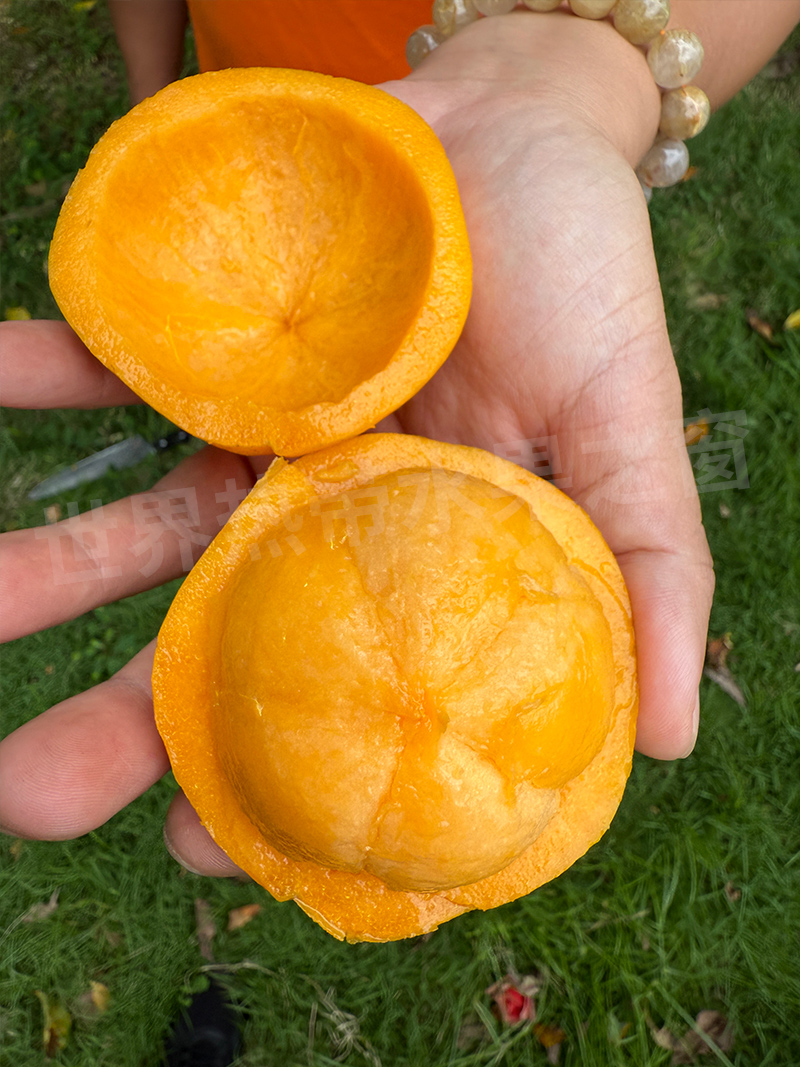 该品种果实外观苹果型,果皮呈金黄色,光滑细腻,仅覆盖薄薄一层。果实质地皮薄肉厚,果肉饱满多汁,呈橙黄色,带有浓郁的芒果和水蜜桃的口感,香甜怡人,不仅适合鲜食,也可用于制作果酱或奶昔。相较于普通黑山竹,金蜜山竹皮更薄,单果最重可达400g以上,且种子较小,可食率超过60%,商品性能优异。