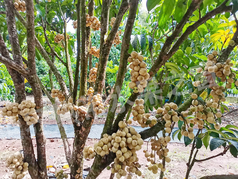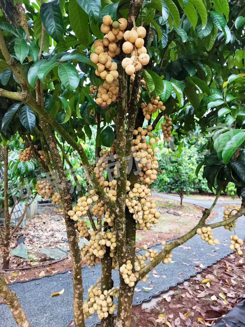 龙贡果,又称椰色果,原产于泰国、马来西亚等东南亚地区,属于楝科兰撒属植物。2013年,海南盛大现代农业开发有限公司将其引进到琼海大路镇的世界热带水果之窗基地试种。经过多年的技术摸索,2019年龙贡果首次结果,2023年开始稳定挂果。