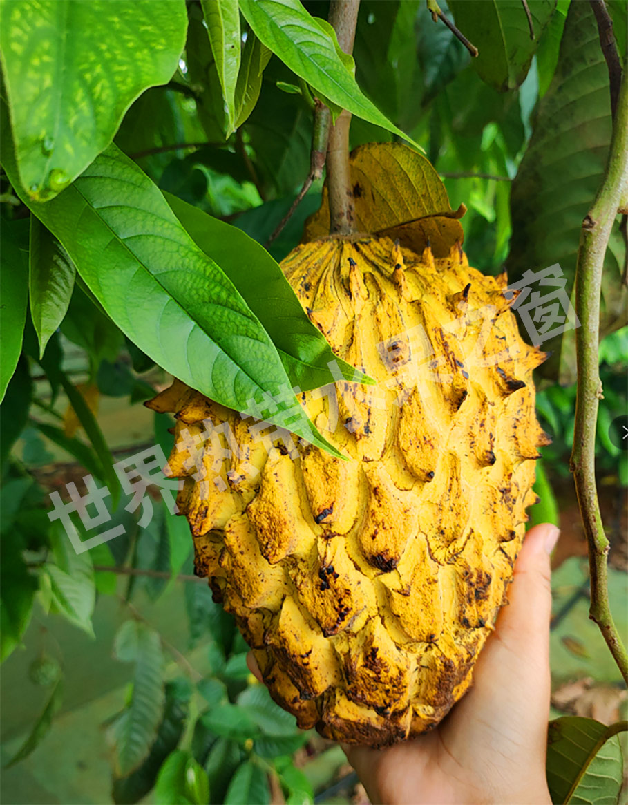 在海南琼海世界热带水果之窗一颗颗金灿灿的“巨无霸”正悬挂枝头 ——霹雳黄龙释迦,这个单果可达10斤重,吃起来的感觉就像果冻一样,软嫩香滑,超级惊喜!