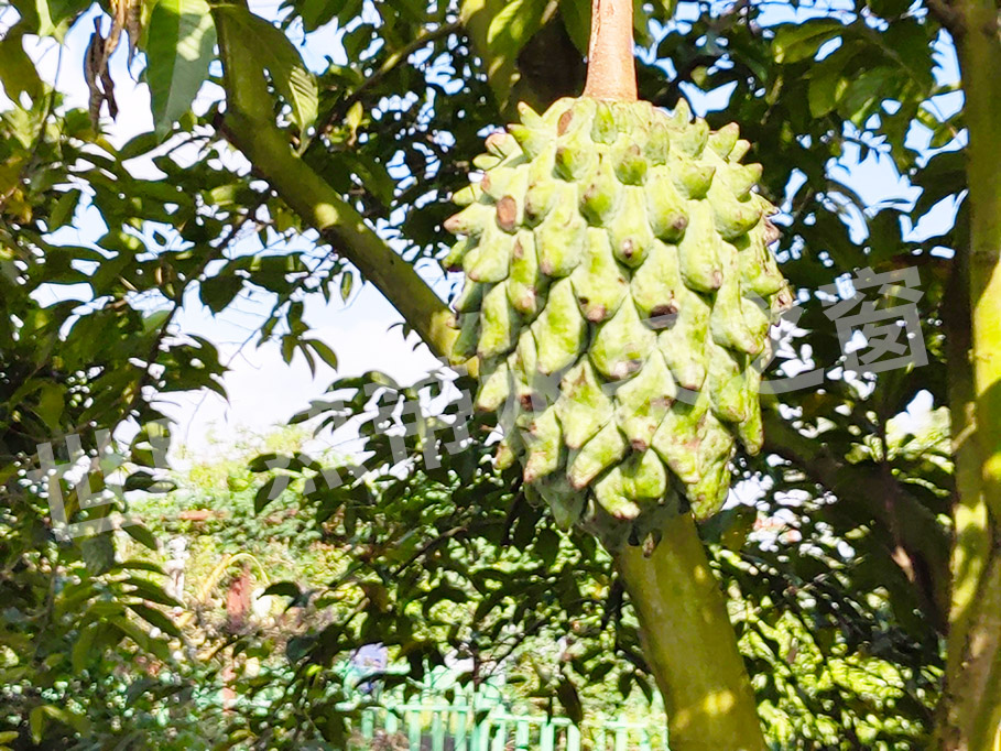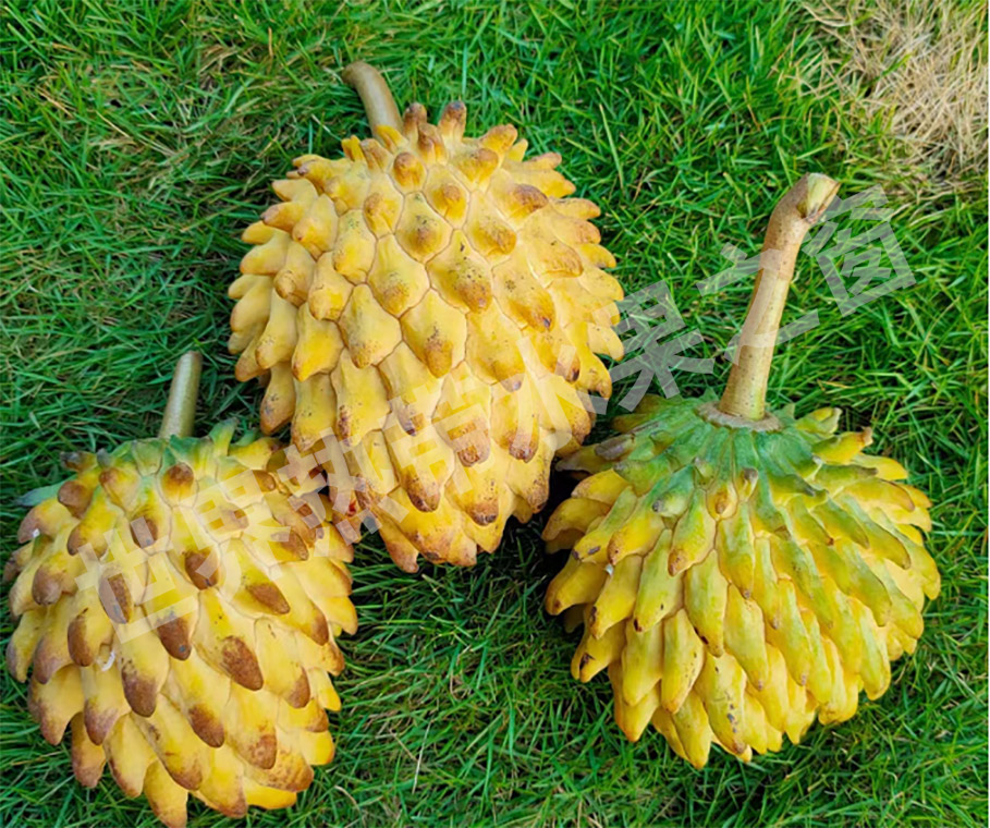 霹雳黄龙释迦生长迅速,优质嫁接苗1年多季挂果,通常果实重量在4-6斤为主,最大可重达10斤,是适合观光采摘的优良品种,旺果期20年以上,亩产可达4000-5000斤,市场售价50元/市斤。