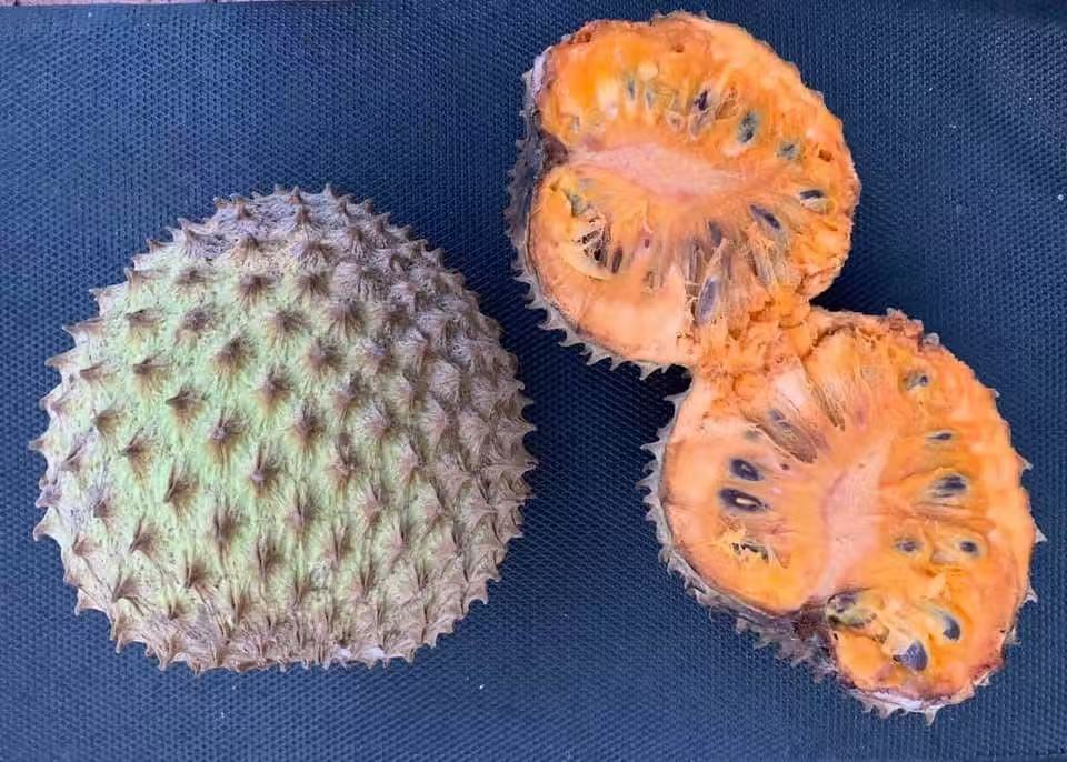 紫霸王番荔枝其果实硕大浑圆,果皮呈棕绿色,表面布满了类似榴莲的钩状突起,粉紫色花瓣呈肉质,绽放时香气浓郁,极具观赏价值。别看外表霸气,内里却别有洞天 果肉橙黄诱人,口感柔软多汁,味道更是层次丰富,甜蜜中带着恰到好处的微酸,具有浓郁的芒果和香蕉的混合香味,一口下去,热带风情瞬间在舌尖绽放。种子不可食用,但它的果肉绝对是味蕾的享受。无论是新鲜即食、榨成果汁,还是做成奶昔、冰淇淋或其它创意甜品,都是绝佳选择。