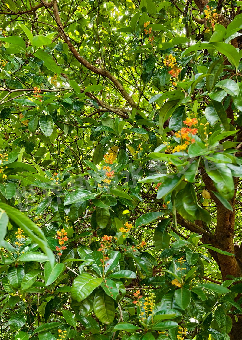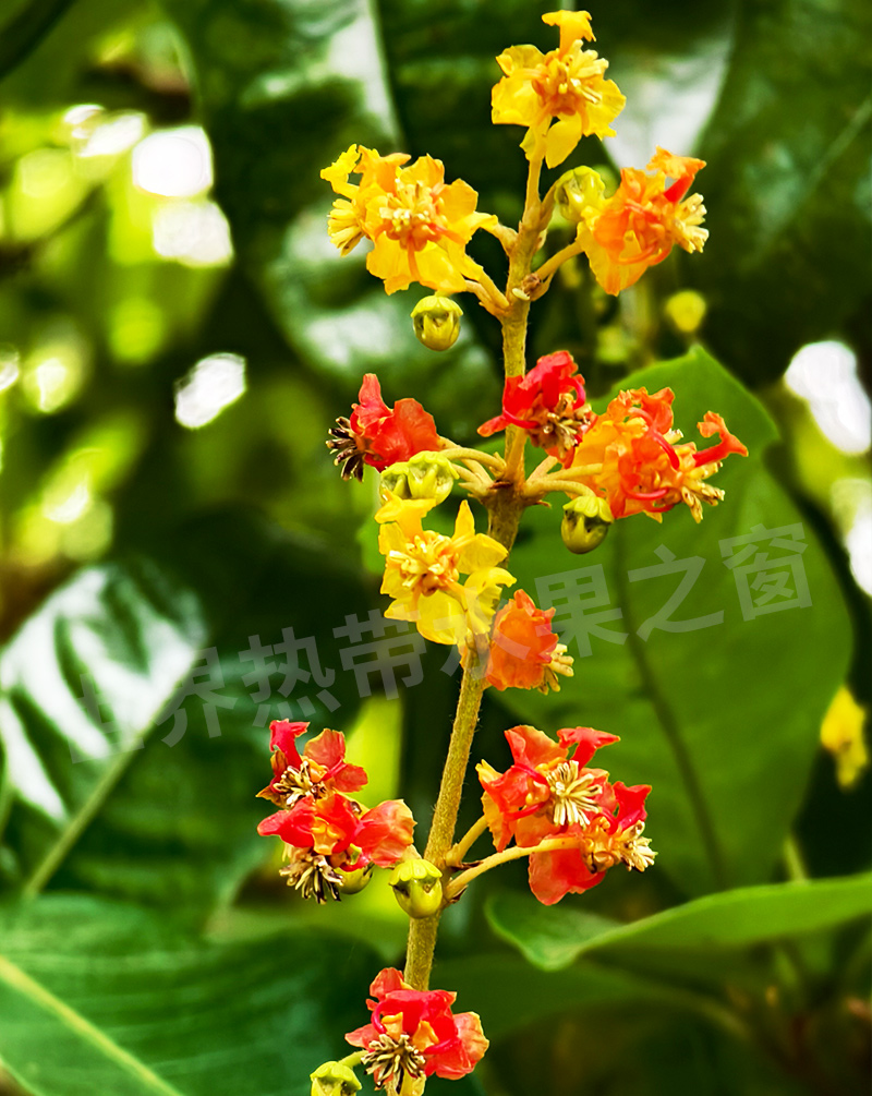 南西果,原产于中美洲和南美洲部分地区。其花穗绚丽多彩,由明黄色渐变为橙红色,最终结出成簇饱满的小圆果,极具观赏性。其果实小巧圆润,表皮光滑,成熟时呈现明亮的金黄色,外形酷似樱桃。