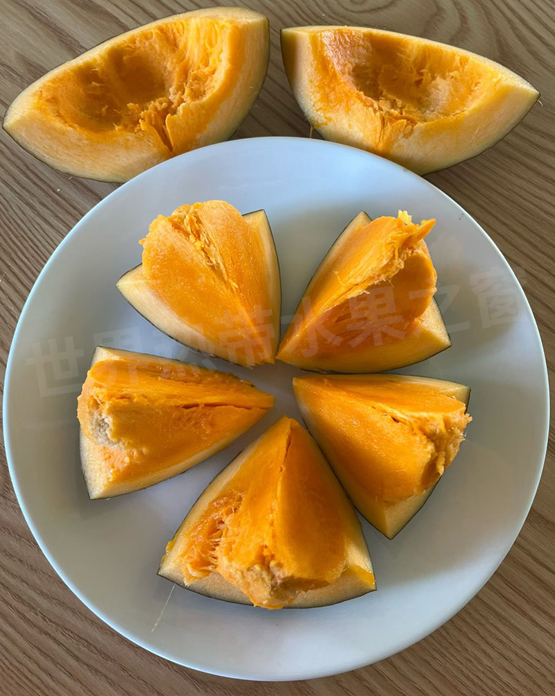 在食用方面,椰蜜果成熟后果蒂周围呈现一圈淡黄色,放置3-5天软熟后风味最佳。切开后果肉橙红、汁多香甜,带有甜瓜、哈密瓜般的清甜。果实通常分为五瓣,初期纤维稍多,完全成熟后纤维减少,口感更佳。