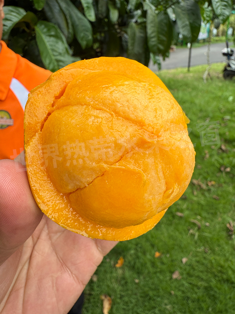 该品种果实外观苹果型,果皮呈金黄色,光滑细腻,仅覆盖薄薄一层。果实质地皮薄肉厚,果肉饱满多汁,呈橙黄色,带有浓郁的芒果和水蜜桃的口感,香甜怡人,不仅适合鲜食,也可用于制作果酱或奶昔。相较于普通黑山竹,金蜜山竹皮更薄,单果最重可达400g以上,且种子较小,可食率超过60%,商品性能优异。